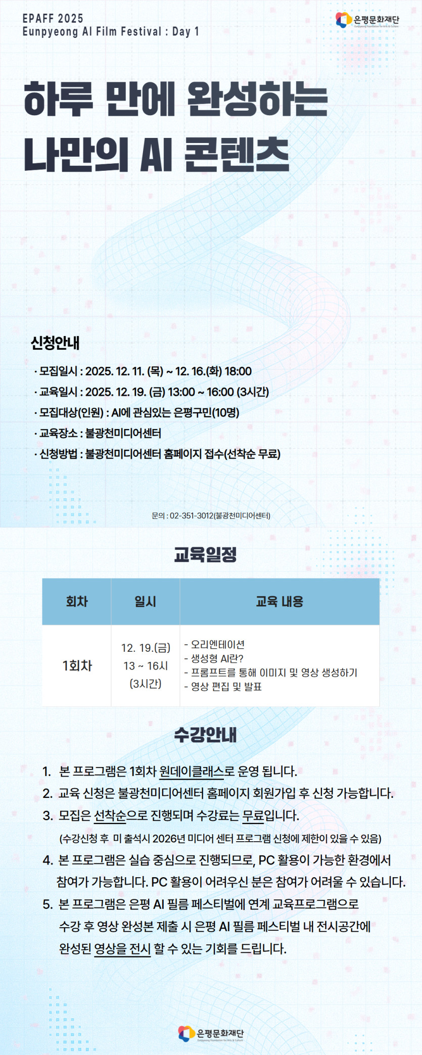 불광천미디어센터에서 생성형 AI를 활용해 나만의 AI 영상 콘텐츠를 직접 만들어보는 원데이 클래스! 수강 후 완성된 영상은 은평 AI 필름 페스티벌의 전시 공간에서 선보일 수 있는 특별한 기회도 준비되어 있습니다. AI 창작에 관심 있는 은평구민 여러분의 많은 참여를 기다립니다! ■ 신청 안내
